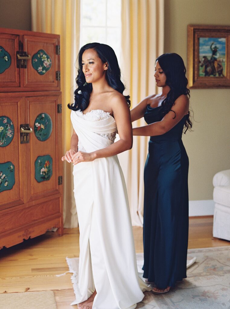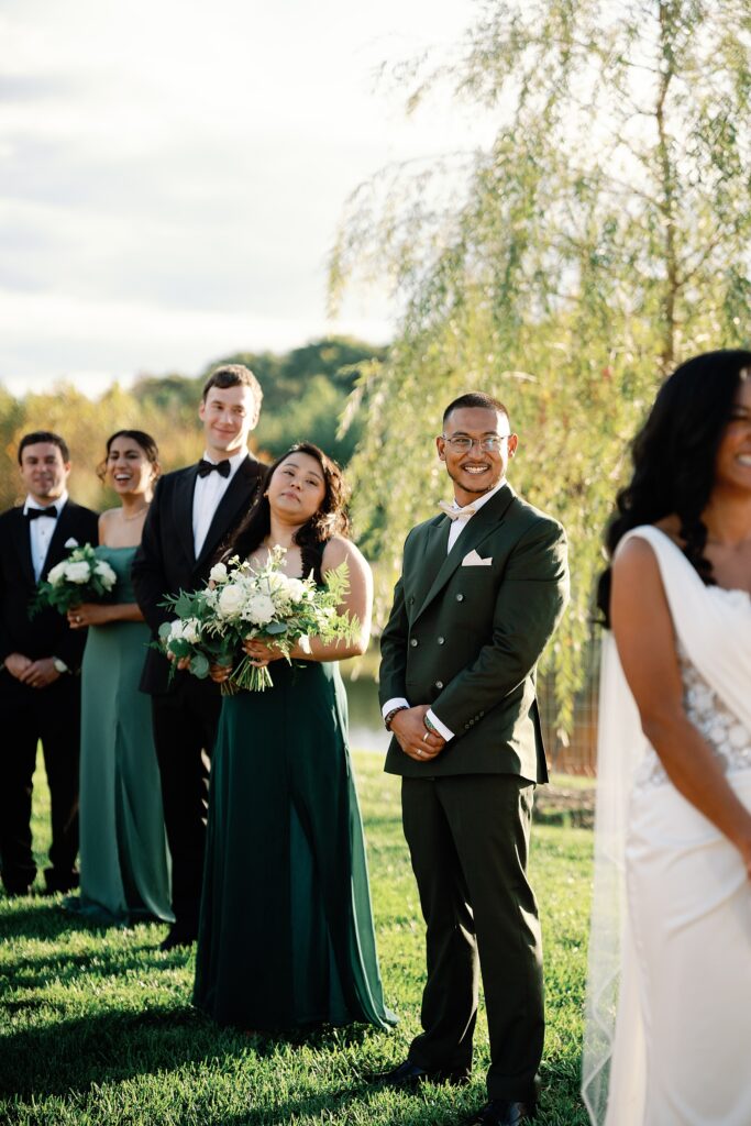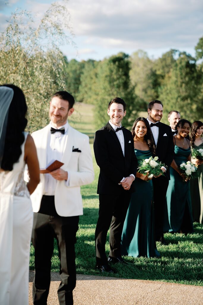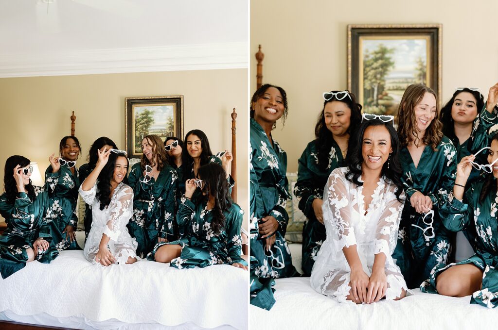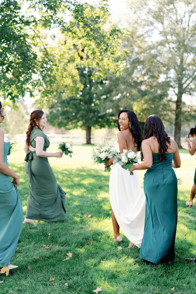 From the moment the bride’s laughter echoed through the getting-ready suite, it was clear this would be a day to remember. Every detail—bridesmaid gowns in deep forest green, lush ivory florals, and her silk robe—felt elevated yet natural. As a Charlottesville fine art wedding photographer, I love capturing weddings that balance refined design with real emotion, and this one delivered in every frame.